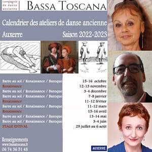 Pour mieux réveiller nos besoins physiques et aussi émotionnels, Bernadette Jacquet et Stéphane Quéant ont décidé de vous retrouver une fois par mois. Tout en maintenant les week-ends trimestriels uniquement consacrés à la danse Renaissance, un programme riche de trois disciplines est proposé où chacun fait son choix. Gudrun Skamletz rejoint la compagnie Bassa Toscana pour enseigner la danse Baroque, Bernadette et Stéphane animent les ateliers de danse Renaissance des Xvème et XVIème siècles. Et un atelier de Barre au sol ! Notre regrettée Zizi disait de la Barre au sol : « C’est une merveille ». La méthode de Boris Kniaseff, enseignée par Jacqueline Fynnaert et pratiquée par Bernadette et Stéphane depuis leur formation de danseur et tout particulièrement pendant le confinement, permet un placement parfait du corps. Amateur ou professionnel, le danseur en ressent tous les bienfaits indispensables à la pratique de la danse, qu’elle soit contemporaine ou historique.