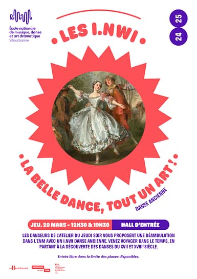 Les danseurs de l’atelier de danse baroque du jeudi soir vous proposent une déambulation dans l’École nationale de musique de Villeurbanne avec un I.nwi Danse Ancienne. Venez voyager dans le temps, en partant à la découverte des danses du XVII et XVIIIe siècle.